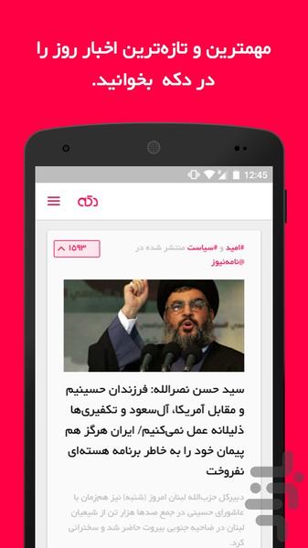 In Dakke, we are trying to provide you with the latest and the most important news. You will find news from all kinds of issues including politics, economics, entertainment, sports, international, science and technology. The beautiful and clean design of Dakke brings you the best reading experience. You are provided with news from different sources including: Isna, Mehrnews, Jahannews, Baharnews, Entekhab, Namenews, Deutsche Welle (DW), Khabaronline, Varzesh3, Digito, Zoomit, Caffecinema, Musicema and Euronews.