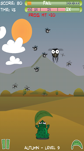 Help the angry frogs fighting against flies, wasps, ants, worms, crickets, fireflies, butterflies, spiders, mosquitos, bees, dragonflies.
