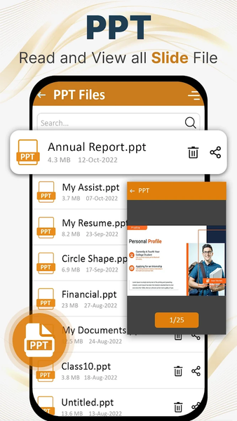 - PPT files reader: support PPT files, search and view all documents in PDF files with high resolution