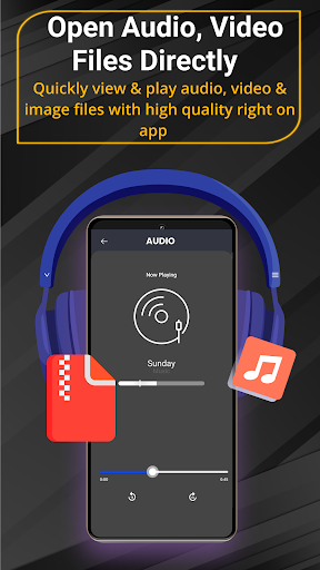 + Fast open multiple file formats including Music Audio: mp3, m4a; Video & Movice: mp4; Photo: png, jpg; All Document Office Reader: xlsx, xls, pptx, ppt, docx, doc and Read PDF files right on app. Easy to play audio, video or read document, PDF immediately after extracting files.