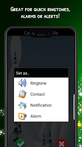 🎄 Simply press and listen to preview the loud and clear ringtone or sound. If you like it, press the green check and then select either ringtone, alarm, notification, or contact. 🎄