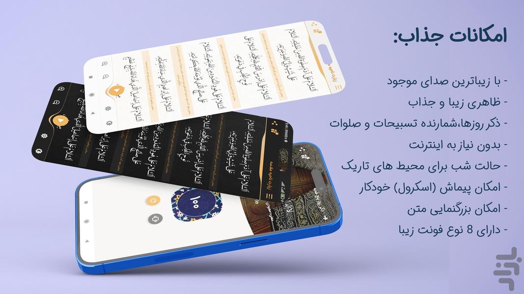 The voice of the singer is the best voice read for pilgrimage to the sacred area. Also, for comfortable reading in dark environments, night mode is also included in Amir al-Mominin's prayers. For dear users who want to read the text in larger sizes, the possibility of enlarging the text is also considered.