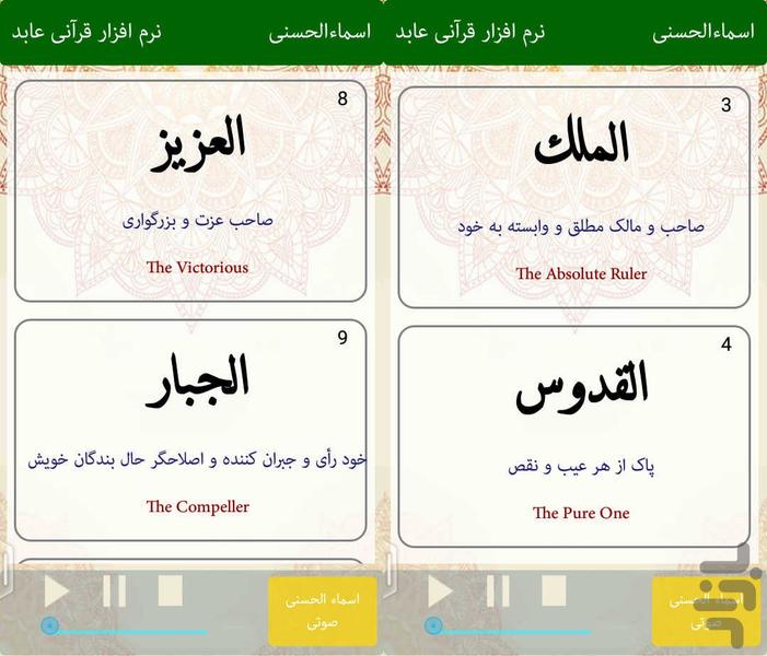 مجموعه کامل اسماء الحسنی به همراه ترجمه فارسی و انگلیسی در کنار نسخه صوتی اسماء الحسنی