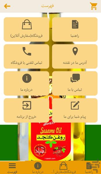 با این برنامه میتوانید به صورت آنلاین محصولات روغن کنجد ساره را سفارش دهید و درب منزل هزینه سفارش خود را پرداخت کنید و سفارش خود را تحویل بگیرید.
