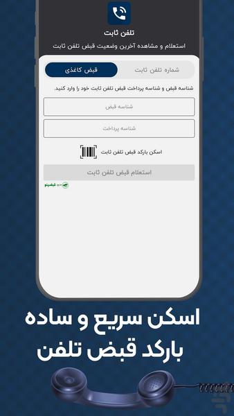 برای پیگیری قبض و بدهی تلفن به کمک نرم افزار پرداخت قبض تلفن ثابت، روش دیگری هم وجود دارد. در بخش قبض کاغذی میتوانید با واردکردن شناسه قبض و شناسه پرداخت، یا اسکن بارکد، بدهی خود را پیگیری کنید.