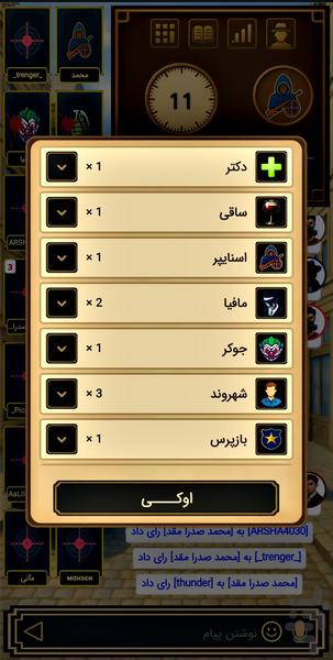 زمان رای گیری: پس از به پایان رسیدن زمان چت روز ، امکان چت برای تمام بازیکنان غیرفعال شده و بازیکنان میتوانند گزینه ای که مشکوک به مافیا هست را انتخاب کنند. هر انتخاب برابر با یک رای است. در انتها بازیکنی که بیشترین آرا را کسب کند از بازی حذف شده و به عنوان کشته روز به سایر بازیکنان اعلام میشود. نقش بازیکن کشته شده به سایر بازیکنان نمایش داده میشود. چنانچه آرا چند بازیکن برابر شود ، سیستم یک نفر را از بین آن چند نفر به صورت تصادفی حذف میکند.