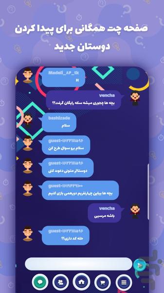 میتونی تو چت دوستای جدید پیدا کنی واونارو به رقابت دعوت کنی یا حتی با سه نفر از دوستات تو دورهمی یه مسابقه خصوصی راه بندازی و کاملا رایگان موضوع سوالات مورد علاقتو انتخاب کنی و رقابتو آغاز کنی.
