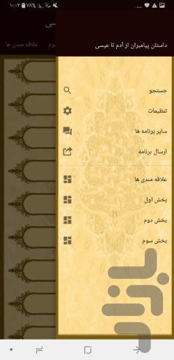 آفرینش آدم؛ ادریس (16)؛ نوح؛ هود (21)؛ صالح؛ ایوب (26)؛ ابراهیم و اسماعیل؛ اسحاق (43)؛ لوط (47)؛ یعقوب؛ یوسف؛ شعیب (56)؛ موسی و هارون؛ ذوالکفل(حزقیل ) (61)؛ الیاس (64) و الیسع (65)؛ داود؛ سلیمان (72)؛ عزیر (77)؛ یونس (80)؛ زکریا و یحیی (82)؛ عیسی مسیح